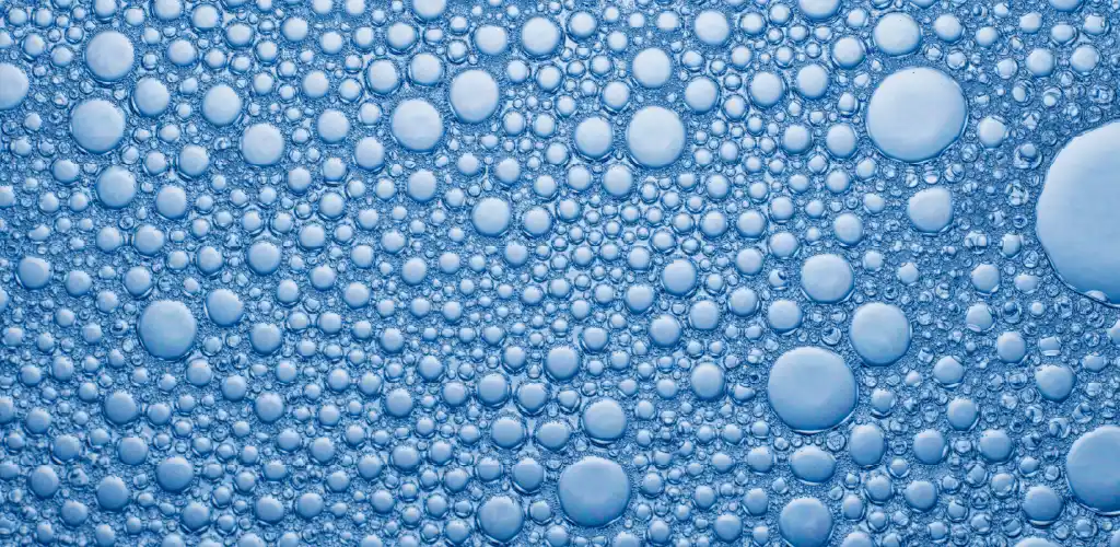 Blue bubbles of varying sizes cluster tightly, creating a pattern resembling soap or water bubbles. The image conveys a fresh, clean feeling.