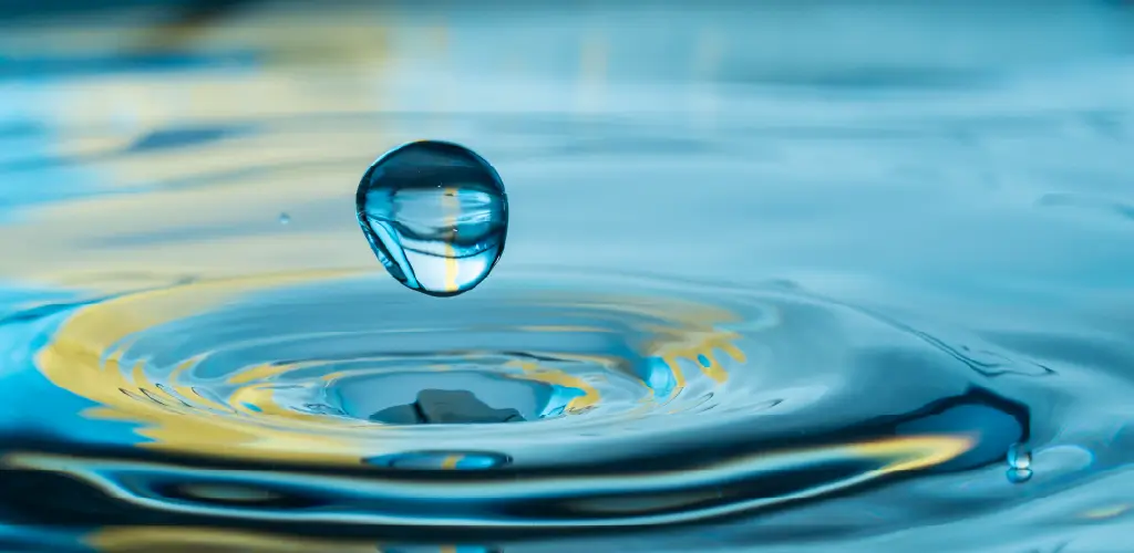 Close-up of a water droplet falling into a calm blue surface, creating concentric ripples. The serene scene reflects soft yellow and blue hues, evoking tranquility.