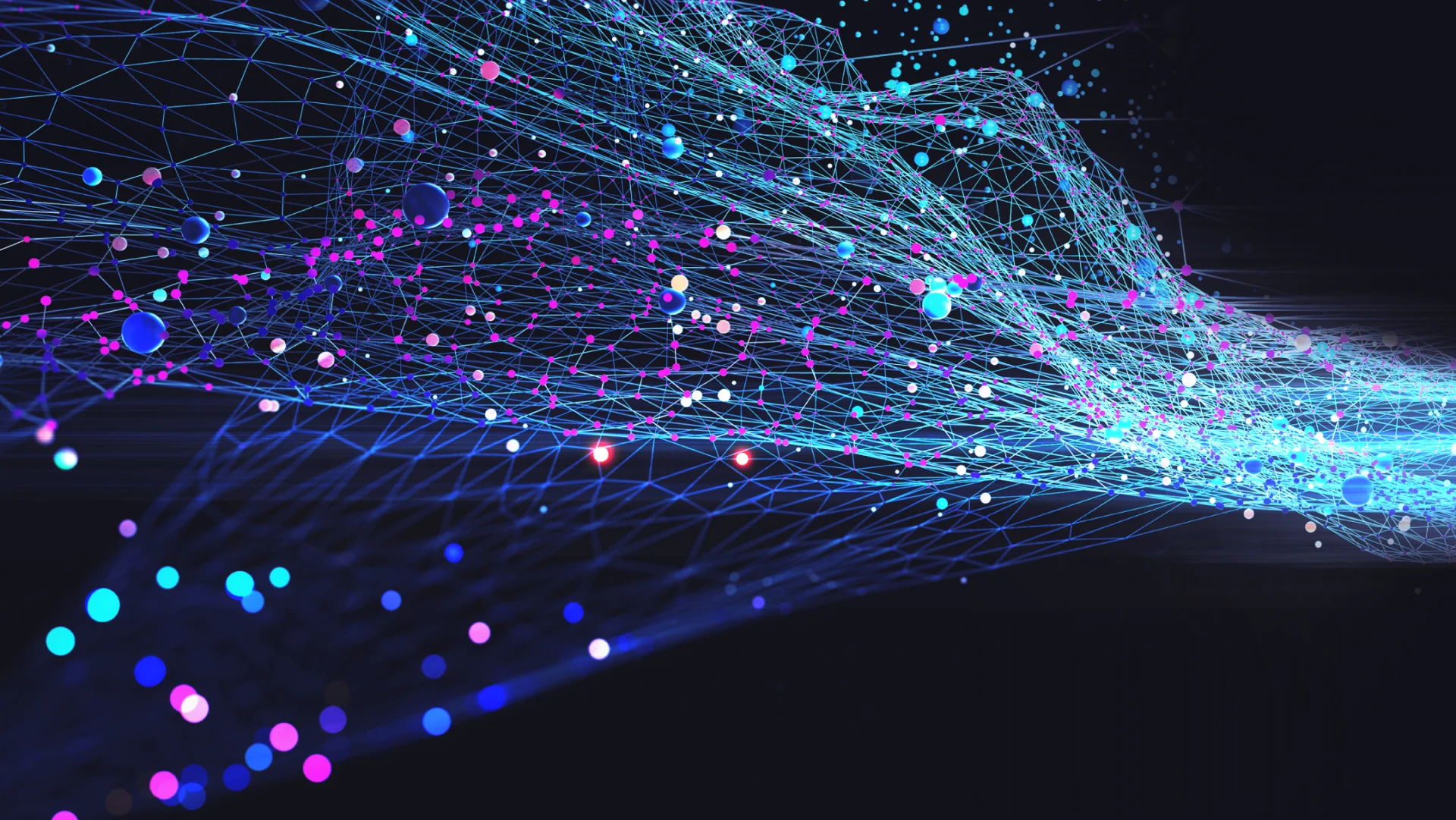 A vibrant digital network with blue and pink nodes connected by light lines on a dark background, conveying a sense of technological complexity and flow.