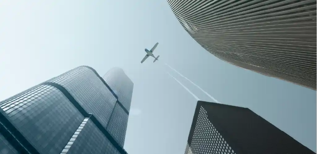A small airplane flies overhead, leaving contrails in a clear sky between towering modern skyscrapers in a city, evoking a sense of ambition and freedom.