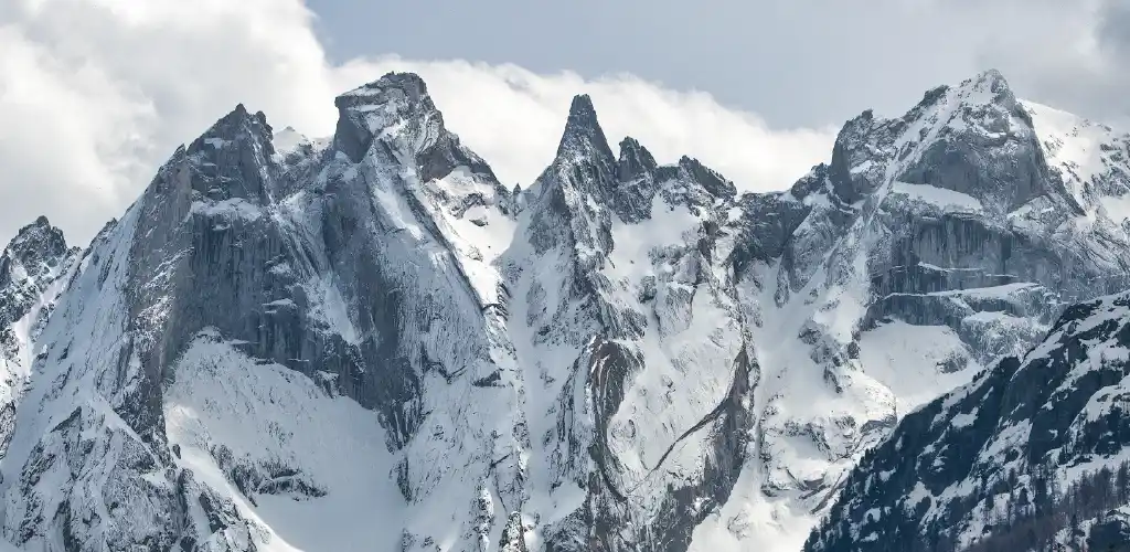 Snow-covered mountain peaks under a cloudy sky convey a serene, majestic atmosphere. The rugged terrain is partly illuminated by soft sunlight.