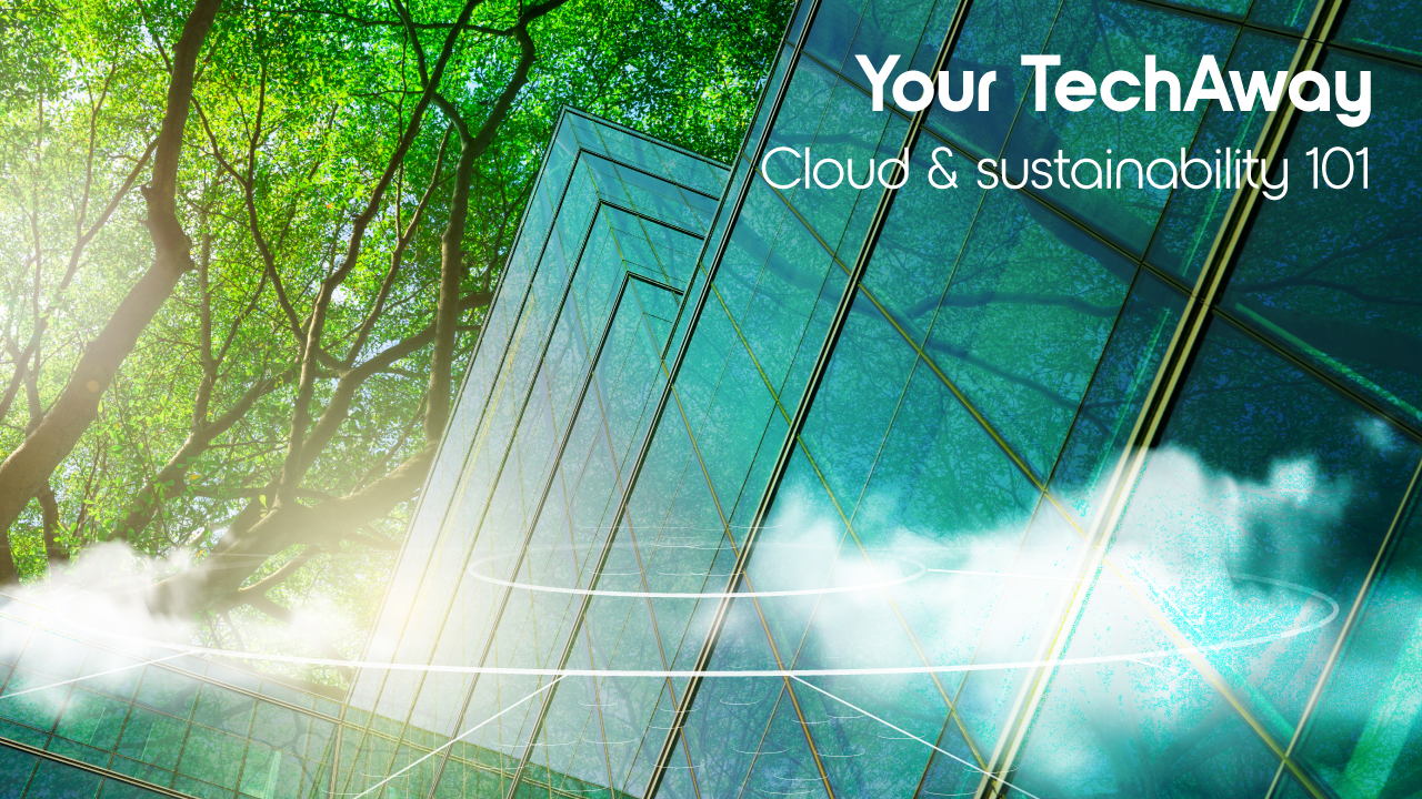 A bright, modern digital design showing green trees reflecting on glass buildings, with white text 'Your TechAway, Cloud & sustainability 101' on top."