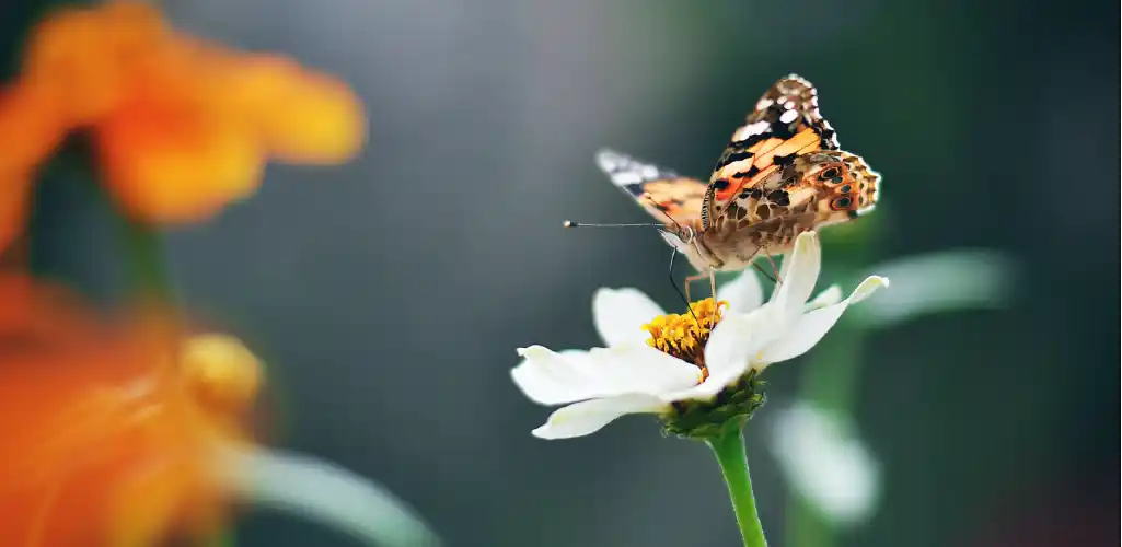 A vibrant butterfly with orange and black wings rests on a white flower with a yellow center. Blurred orange flowers in the background add depth.