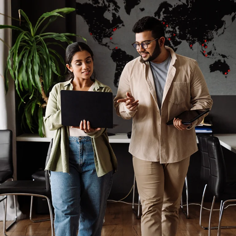 Two colleagues walking through an office holding laptops and discussing a project, symbolising business consulting.